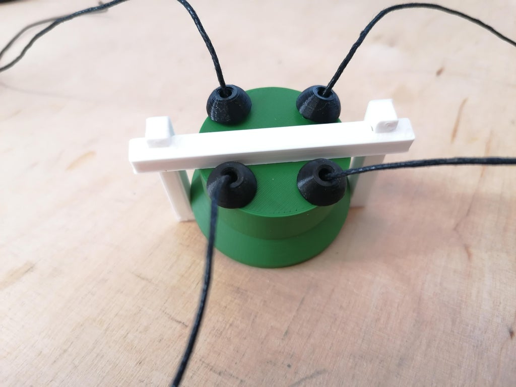 You should start by passing the thread through the corresponding holes of the button, like it's shown in the first picture. After that's done, place the spring and the button inside the standard_support, while pulling on the threads at the same time.