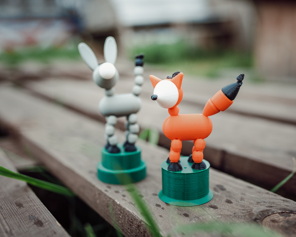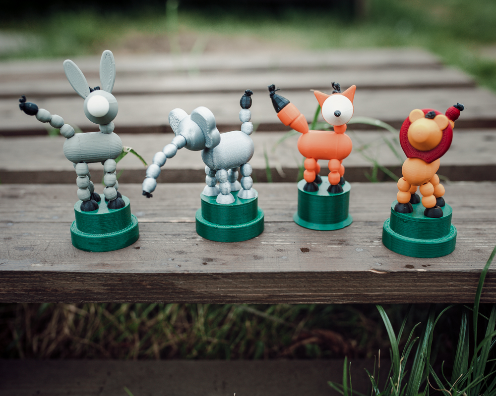 - The legs and the tail of collapsing animal toys are composed by the files standard_pearl and standard_foot (except the fox and pig tails composed by specific pearls). So print the standard_pearl and the standard_foot as many times necessary.