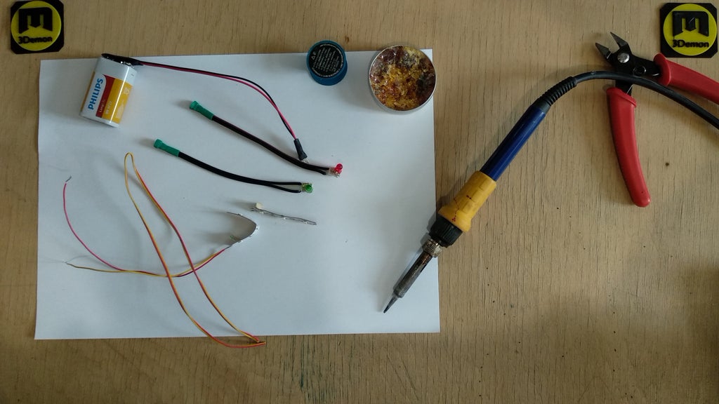 - Test which way you're supposed to solder the LED by connecting it to the battery. If it's not glowing try the other way.