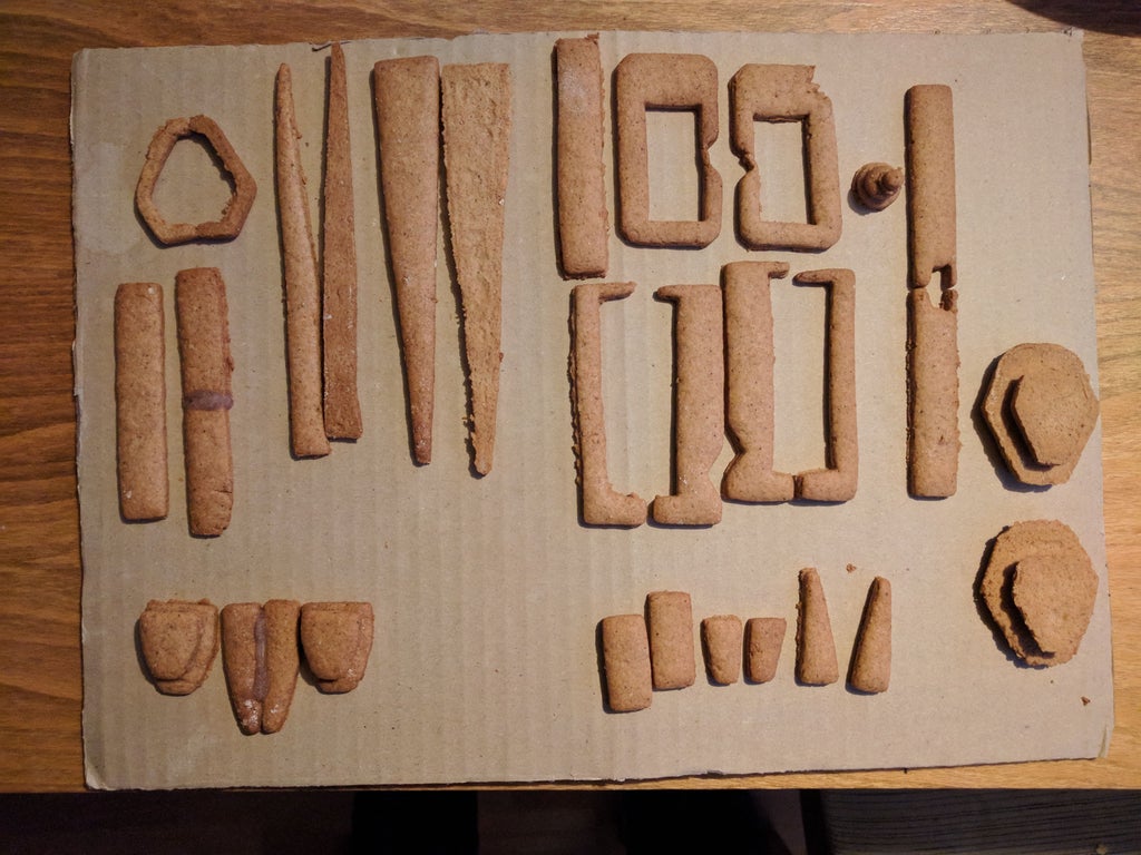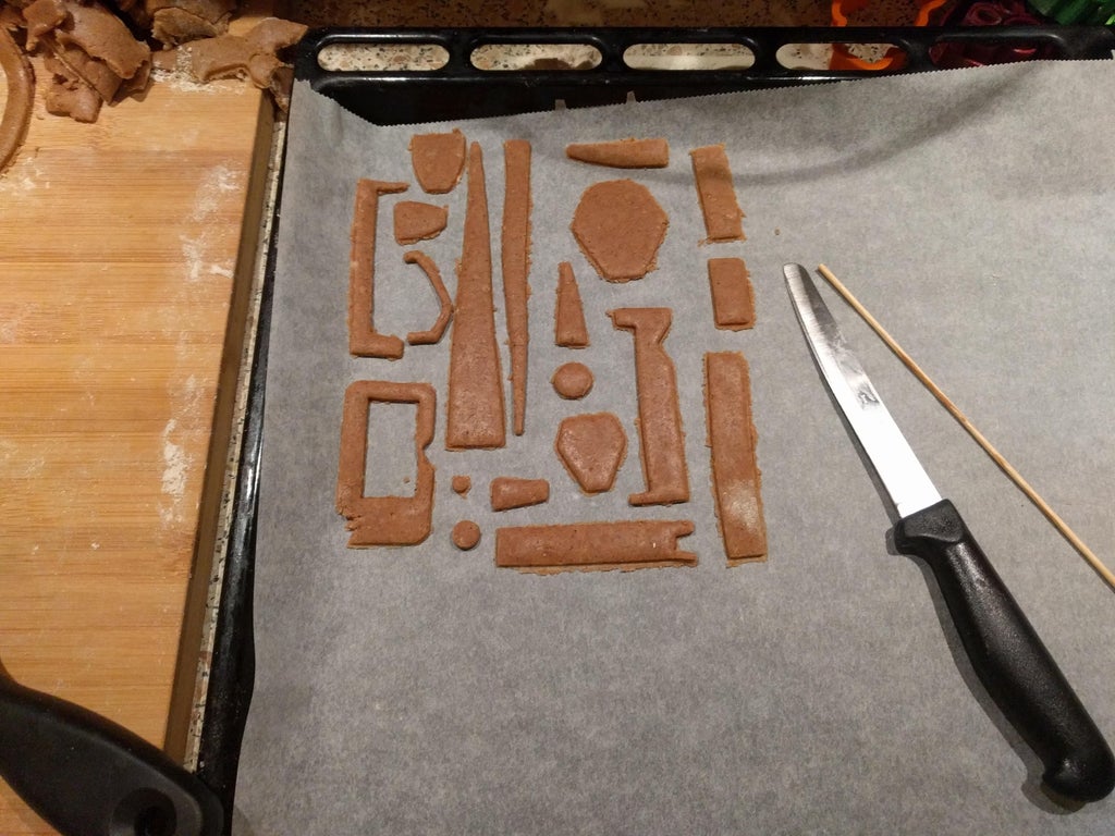 It's good to cut it straight away on the backing tray with the baking paper so the parts don't get distorted when transferring it. When you have everything cut out bake it at 160°C (320°F) for 10 minutes. The small pieces did get a bit burnt so keep an eye on them and maybe take them out sooner than the others. Let them cool down before manipulating with them so they keep their shape. If they deform in the oven then a good time to adjust them is before they cool down.