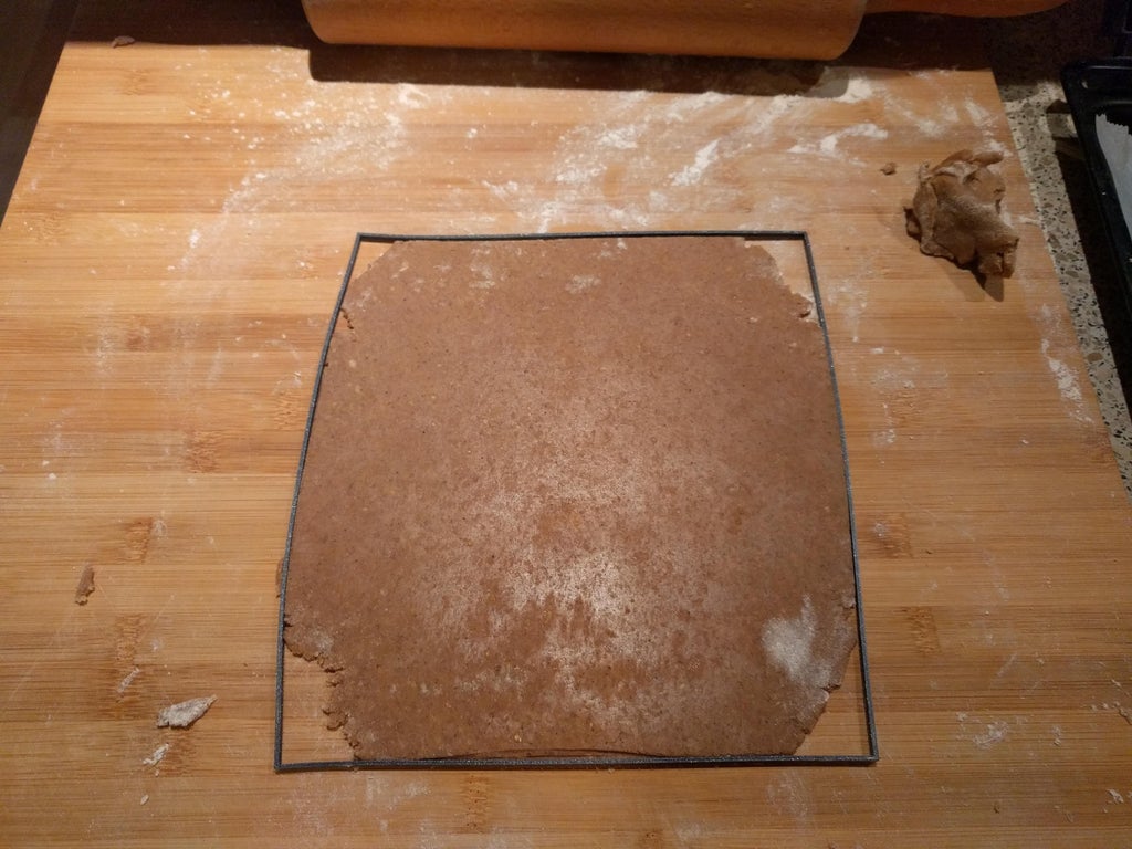 After letting it rest take the dough from the fridge and roll in into 6 pieces 20×20 cm squares 3mm thick. You can use the 3D printed guide or just measure it.
