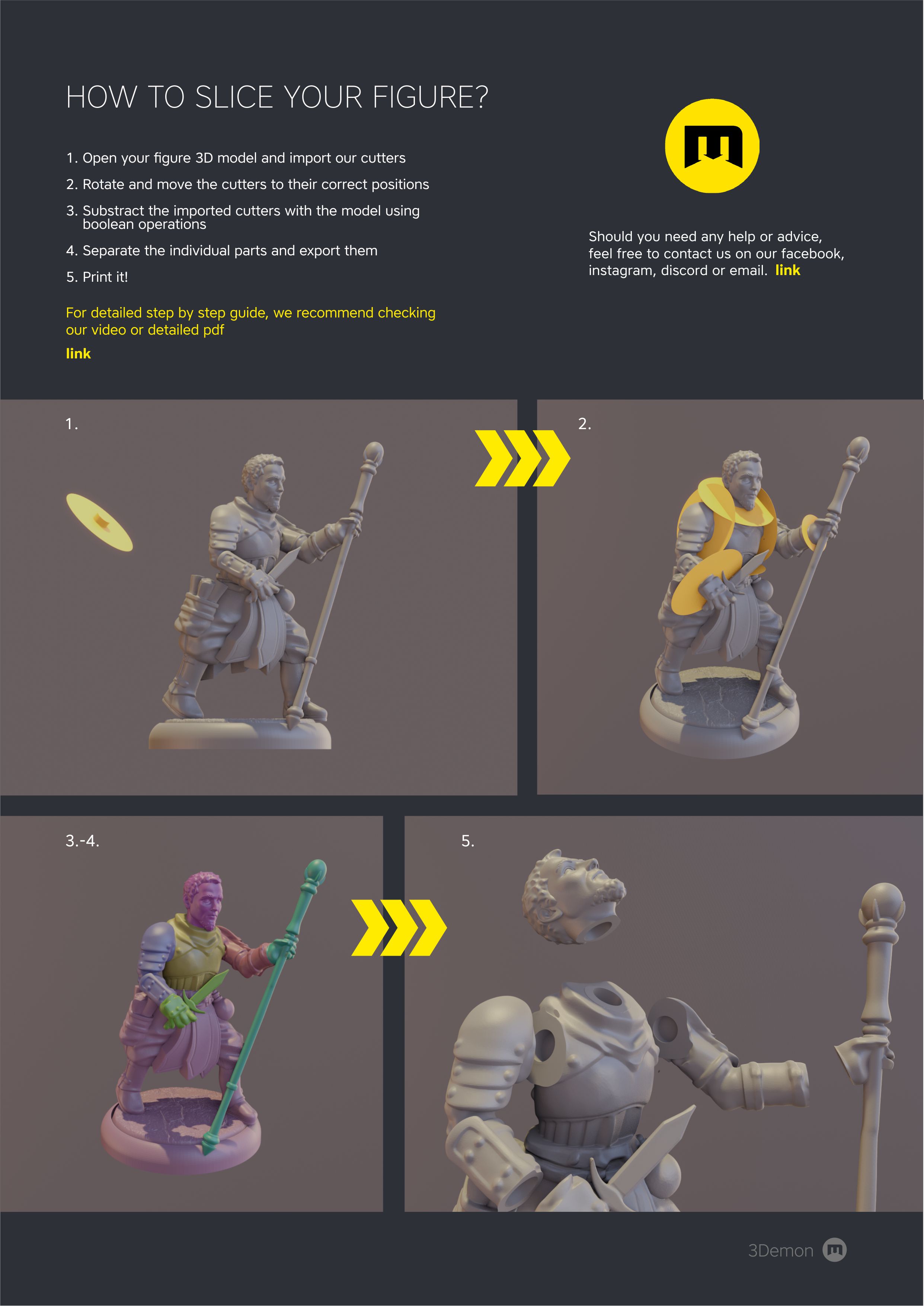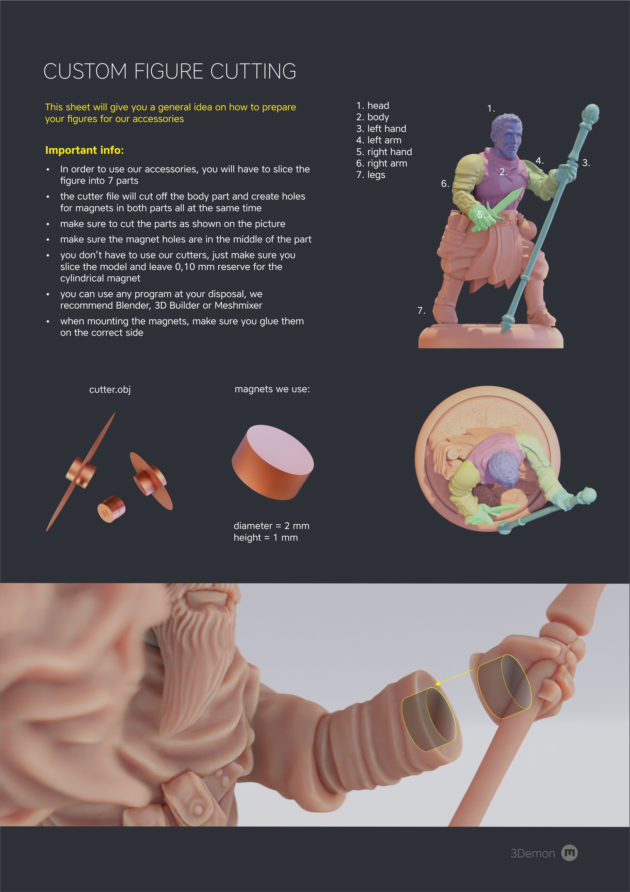 Make your DnD hero modular by cutting it and adding magnet slots! You'll end up having thousands of assembling variations! You can cut any 3D printable figure, such as your own heros from the Hero Forge.