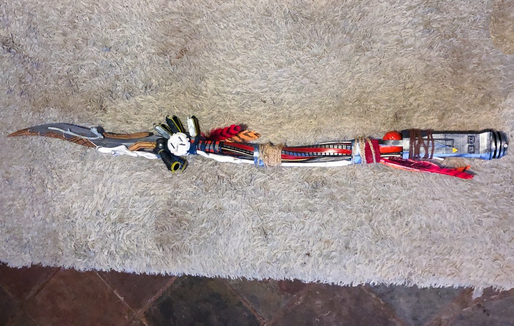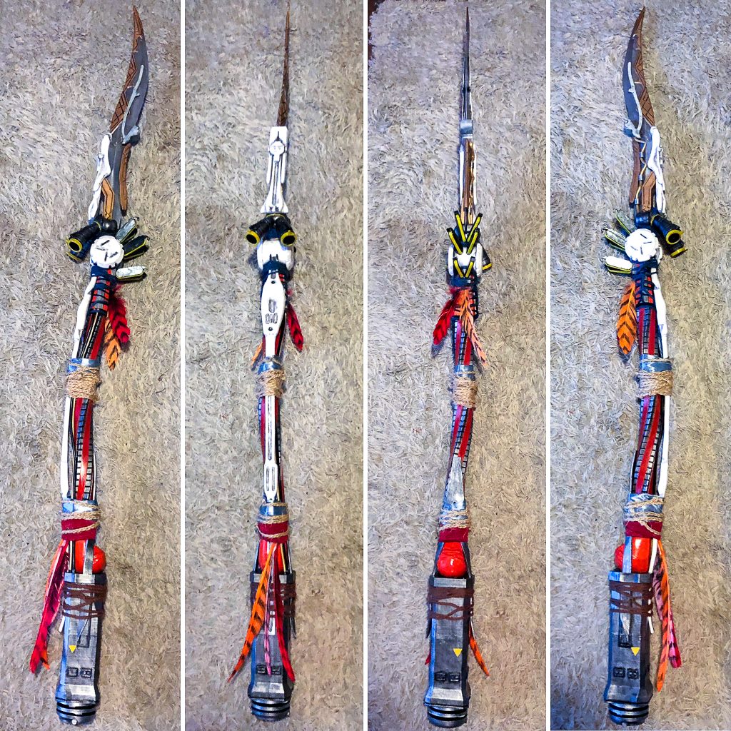 In the Horizon Forbidden West game, the spear is built of machine parts but decorated with natural resources such as colorful feathers, natural cord, colorful rope, and small pieces of fabric.