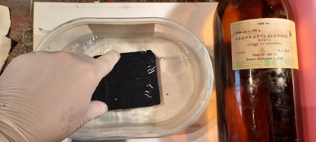 You can also use UV sensitive resin which is used as a refill for LCD / DLP 3D printers. It provides a very pleasant result, the printed model is smooth and much easier to work with, but you need more than just a brush when compared to XTC 3D. The surface of the model needs to be cleaned and degreased, isopropyl alcohol was used here. After curing, the model remains slightly sticky again and remnants of uncured resin must be washed out, in which case isopropyl alcohol (IPA) is suitable. Just 5 minutes and the model is ready for further processing.