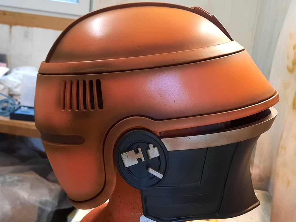 Fennec Shand wore her helmet closed, or the narrow window was ajar. Therefore we had to stabilize both positions. The open helmet is given by the construction of the helmet itself, the closed one must have a support so that the lower part does not fall when worn. We solved it with a piece of translucent foil, which is used, for example, as part of a shield for medics. We added two rivets, printed from PETG, to the inside of the helmet and glued them with instant glue. The foil is connected to the upper rivet so that it does not slip out, on the contrary, the helmet can be removed from the lower rivet so that the owner can wear it open or closed.