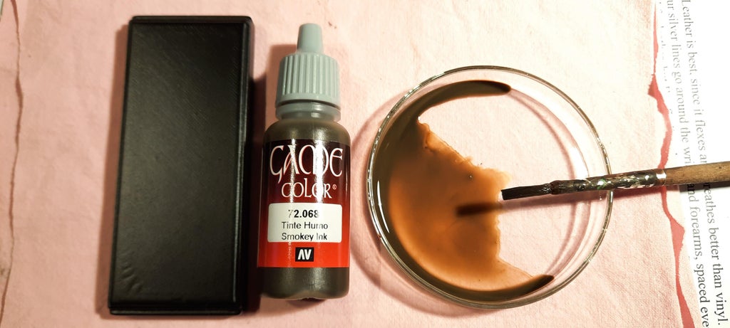 After drying, we made abrasions with silver acrylic paint using the dry brush method. The color is a bit lighter than the one we used on the silver part of the helmet. We used an old and worn brush. After finishing, we coated the whole helmet with two layers of clear matt protective spray paint. We used a different approach with the accessories. Here we used a diluted color (brand Smokey Ink) which we applied to the corners, crevices and on a part of the smooth surface and then dried with a cloth. But be careful not to wipe, just apply it and let it soak.