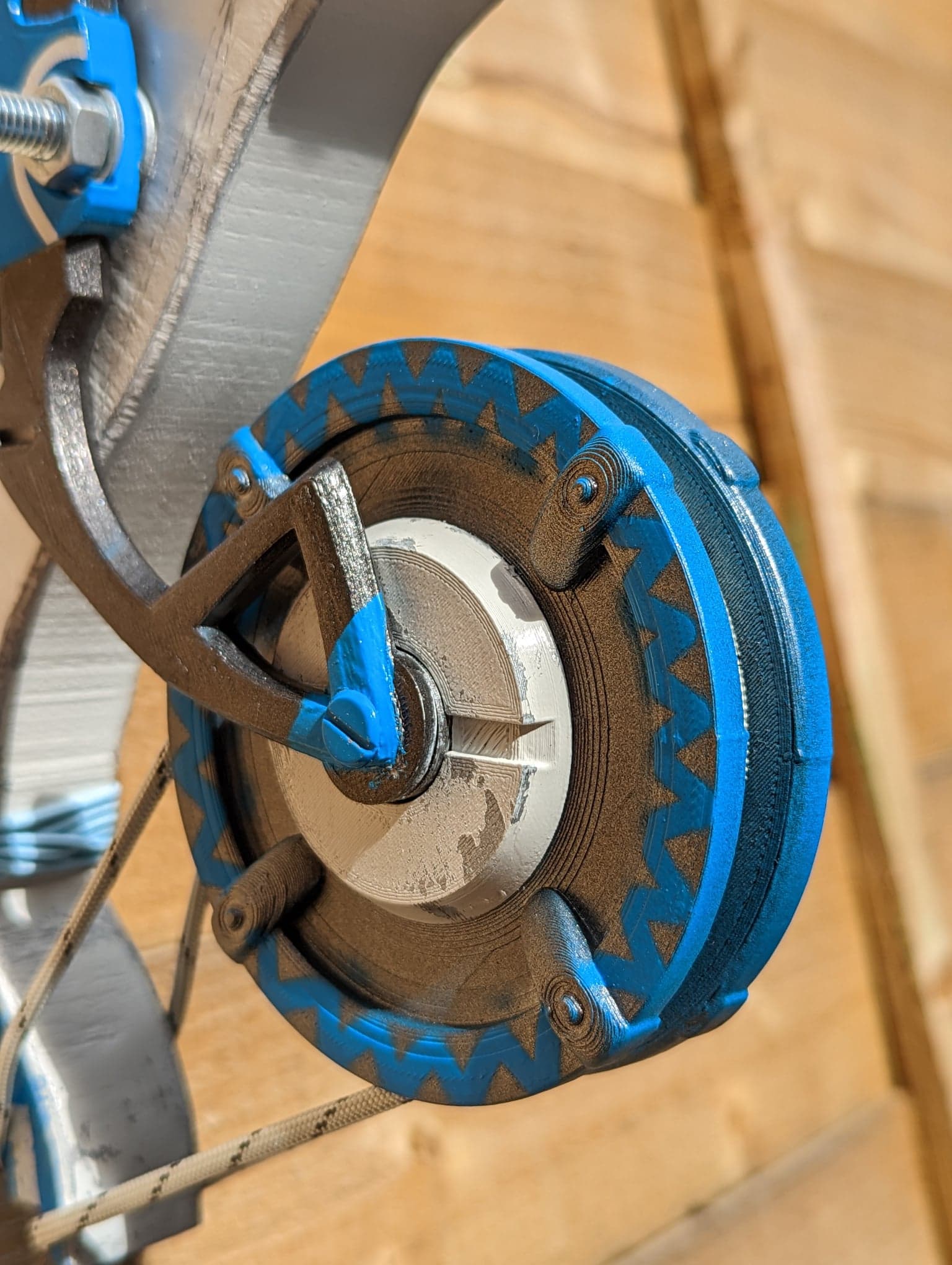 The bowstring (a thick rope with a nice pattern in this case) should be wrapped around the pulley 2 times.