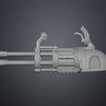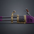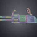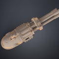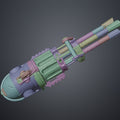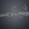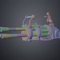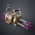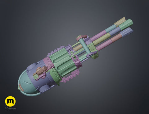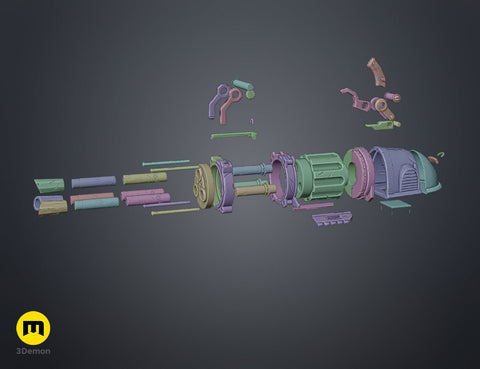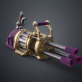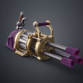 This is a digital 3D printable model of Jinx Pow-Pow Minigun from Arcane. The drum of the minigun is mounted on an axle, which allows the barrel to rotate when you push it.