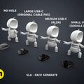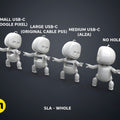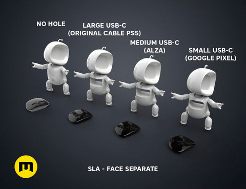 There is a version that fits the black rectangular end of the cable that comes with a PS 5 console but because I liked it better with a white cable, there are two other versions that fit different, smaller, types of USB-C cables. There is a version that doesn’t have a hole in the chest for a charger if you just want it to cuddle your console or anything else.