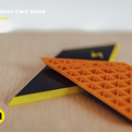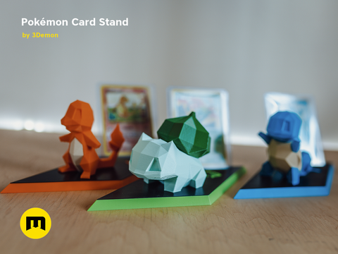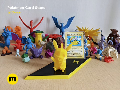 These models were designed to display Pokémon cards. The card in the stand is tilted back slightly and the area in front of the card is meant for displaying a 3D representation of the Pokemon. It is not directly in front of the card to not obstruct view of it. You can have a look at our Low Poly Pokémon collection if you’d like some models to with it.