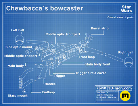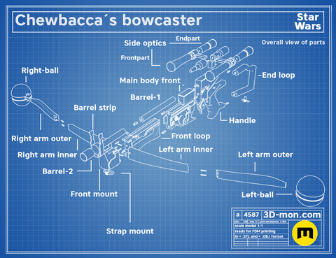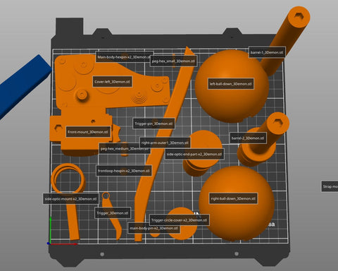 The STL files are named in the same way as the parts in the blueprint pictures to help you with assembling the blaster.