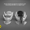 As the mask is quite big, it is meant to be post-processed. We recommend a layer height of 0.15 to 0.3 mm on FDM printers. For reliable printing, we also recommend setting a brim to the helmets shell parts, because of their height and low thickness. It will ensure, that the parts will not come off the printing platform during the printing process. Printing settings will vary greatly depending on your specific printer.