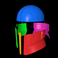 The download contains pieces of the model ready to be 3D printed on a 200 mm print bed and files that are not cut into smaller pieces. All cut parts are placed on the print bed as we would print them to save you time. The parts are connected via pins that can also be printed. We recommend using a black plastic sheet to create the eye shield. This 3D model is meant to be used as a wearable cosplay helmet.