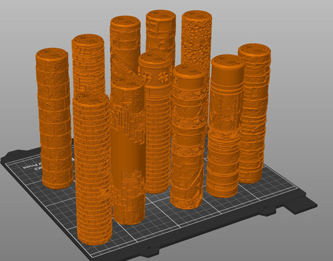 These digital 3D printable models of Stamp Rollers are meant to be used to create patterns of various terrains for Dungeon and Dragons! They can be used on modeling putty, clay, or XPS polystyrene. The rollers are 15 cm high and the length of the pattern is 10 cm (6 x 4 squares, each 2.5 cm).