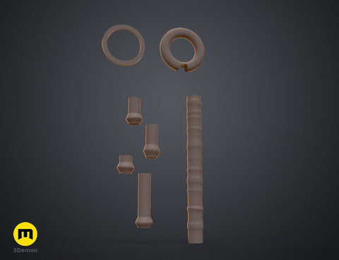 The Staff can be assembled using 4 parts (printed multiple times), 2 handle parts, ring