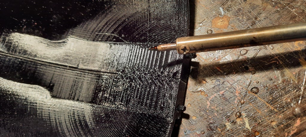 When gluing PETG (but also PLA) a common instant glue will suffice. We prefer an adhesive with a gel consistency. Insert the pins in the holes first and make sure everything fits. Lightly sand, clean and degrease the edges before applying the adhesive. Apply the glue with a brush and press the parts of the helmet together for 20-30 seconds. Another possibility of strengthening the place of joining is gluing another plastic or fibreglass sheet from the inside with a soldering iron. If you are skilled with a soldering iron you can even smooth out the joints from the outside and this way you won't need further filling and sanding down.