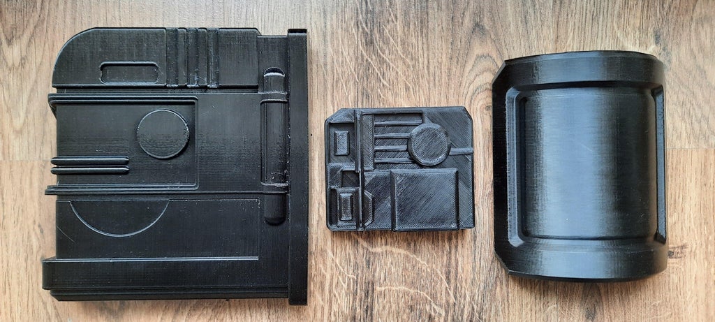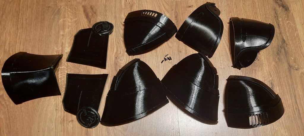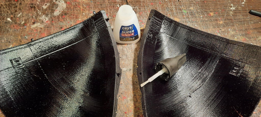 The accessories for Fennec Shand cosplay don't need any gluing but in our case, the helmet had to be glued together (if you have a big enough printer you can print the helmet whole and skip this step). The helmet files also contain small pins that fit exactly into the holes on the helmet and the parts fit together nicely.