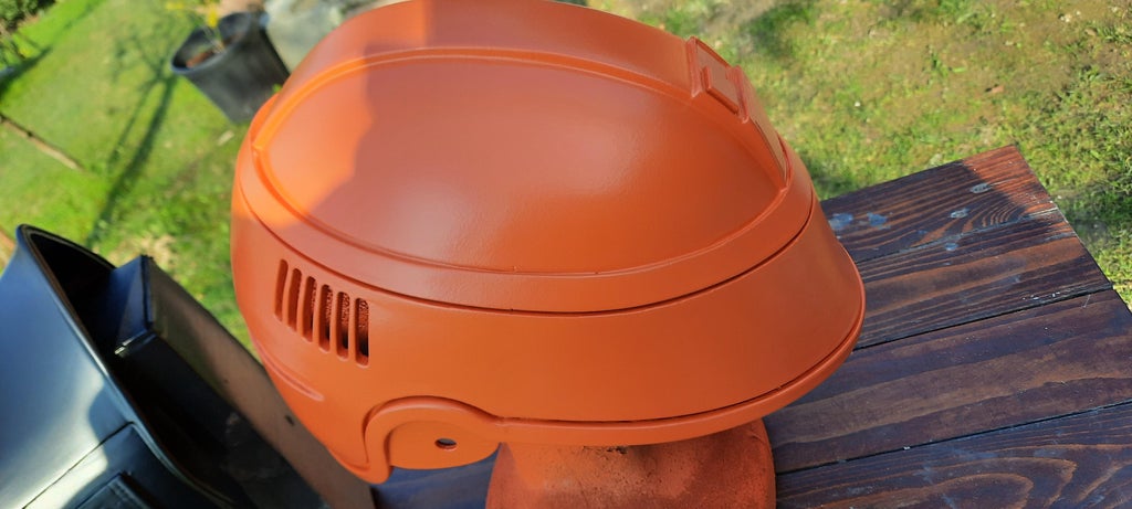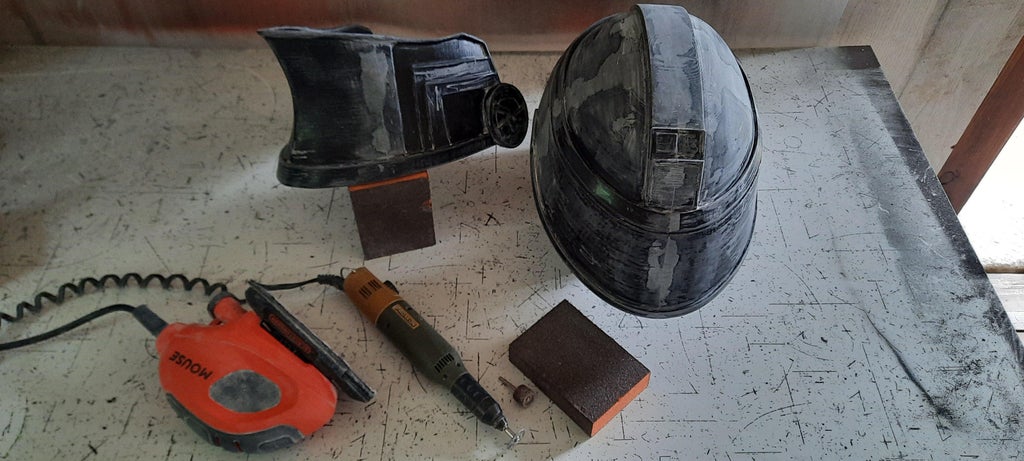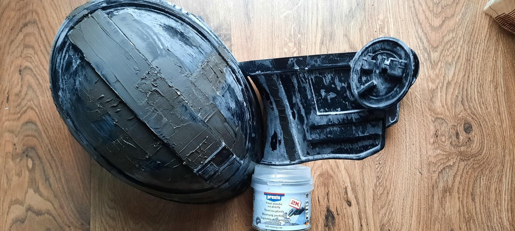 The helmet needed sealing to hide the seams. We used a filler for plastics and then sanded it down and covered it with primer and spray paint.