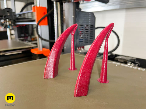 For parts that are tall but have a small base, we use a 10 mm brim for better bed adhesion.