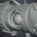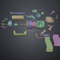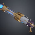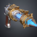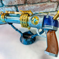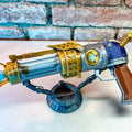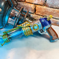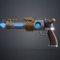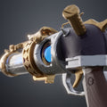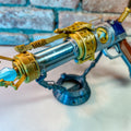 - The blaster features a mechanical hex-gem chamber with an “iris” opening.