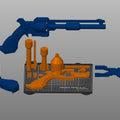 The download contains pieces of the blaster ready to be 3D printed on a 200 mm print bed and files that are not cut into smaller pieces. All cut parts are placed on the print bed as we would print them to save you time.