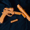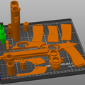 The download contains pieces of the blaster ready to be 3D printed on a 200 mm print bed and files that are not cut into smaller pieces. All cut parts are placed on the print bed as we would print them to save you time.