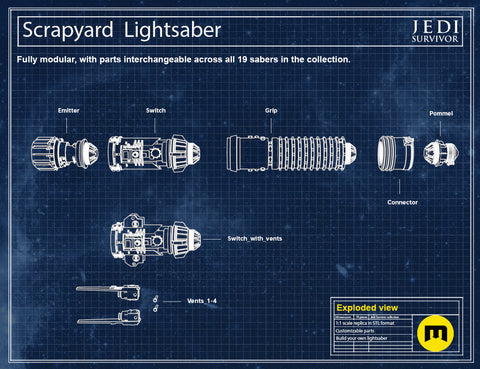 • STL files for each lightsaber part that can be swapped and combined with other lightsabers in the collection.