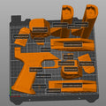 The download contains pieces of the blaster ready to be 3D printed on a 200 mm print bed and files that are not cut into smaller pieces. All cut parts are placed on the print bed as we would print them to save you time.